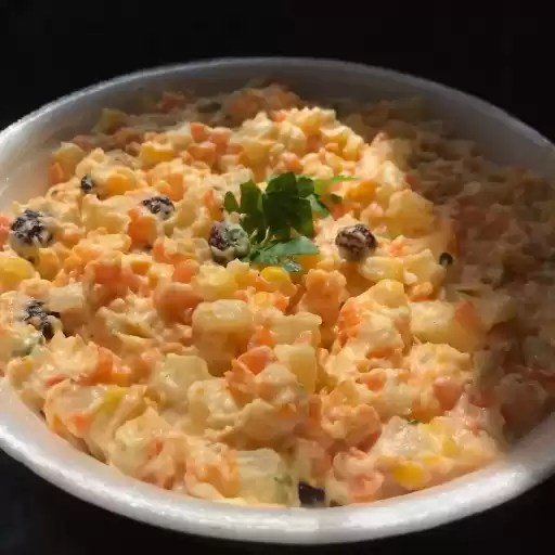 frango desfiado, cenoura, milho, presunto, passas, batata palha e maionese